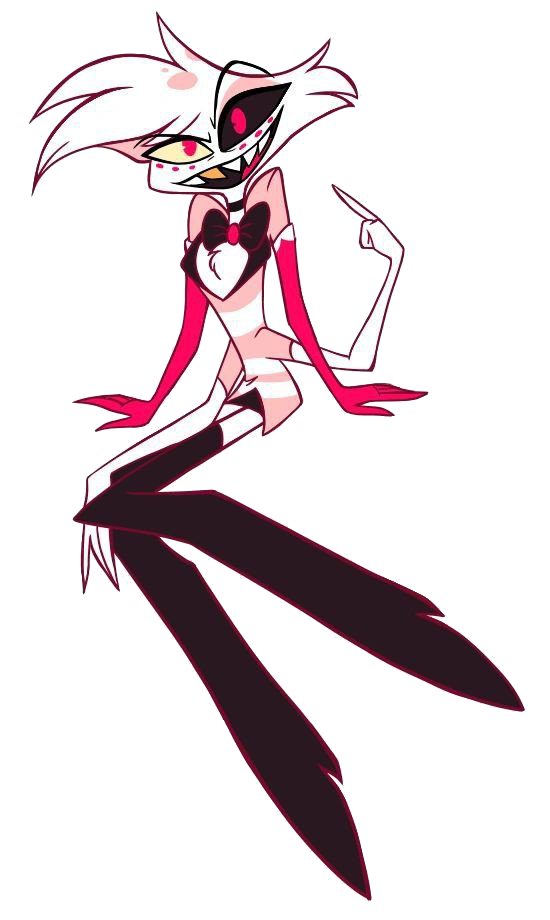 PHYSICAL DESCRIPTION: Angel is a Sinner Demon, formerly human. He is a white and pink spider demon, with legs for days and at least one additional pair of arms. (He has a third set generally concealed within his body to whip out when needed, bringing his total limbs to eight.) He stands roughly 8 feet tall in his heels. He sports a fluffy coat of fur that is especially prominent on his chest, and he plays up the resemblance to breasts.